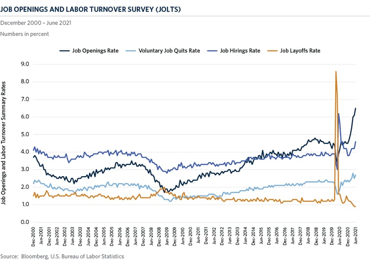 The U.S. labor market continues to recover from one of the worst declines in employment since the 1930s. In the early days of the pandemic last April, demand for labor plummeted and the unemployment rate reached 14.8 percent. Today, job openings and voluntary job quits are both at their highest levels since the Bureau of Labor Statistics “Job Openings and Labor Turnover Survey” (JOLTS) began in 2000. The record job vacancies indicate the surge in demand for workers as the economy continues to reopen. The sectors experiencing the largest increases in openings include those most impacted by the COVID-19 pandemic, specifically leisure and hospitality, accommodation and food services, healthcare and social assistance, retail trade and manufacturing. And yet, while jobs are plentiful in those sectors, employers have had a difficult time filling those positions as evidenced by the lackluster recovery in the hiring rate.