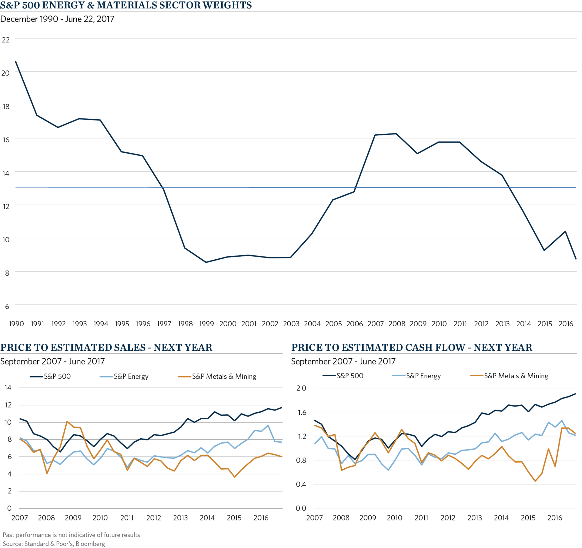 While we counsel long term strategic allocations to the sector, recent relative underperformance has driven the natural resource sectors market weights well below their longer term average. This potentially increases the risk to traditional portfolios to an inflationary environment as the sectors with the highest positive correlation to CPI have been reduced. Additionally, we show the price multiples for the broad S&P 500 index and the S&P 500 Energy and Metal & Mining sectors indicating pricing may present a good relative entry point.